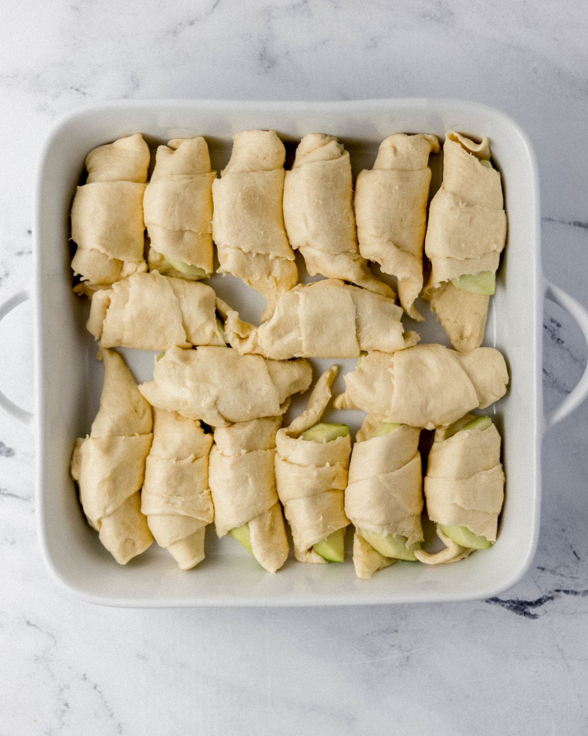 - Assemble dumplings: Unroll 2 tubes crescent dough and separate into 16 triangles along perforations. Place one apple slice at the wide end of each triangle. Roll dough around apple, starting from the wide end and rolling to the point. Place seam-side down in prepared baking dish. Repeat with remaining dough and apples.