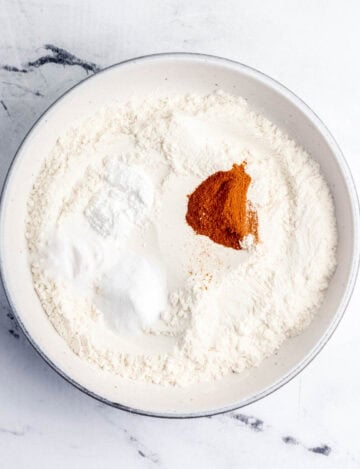 - Mix the dry ingredients. In a medium bowl, whisk together the 2 cups flour, 1 teaspoon cinnamon, 1 teaspoon baking powder, ½ teaspoon baking soda, and 1 teaspoon salt until well combined.
