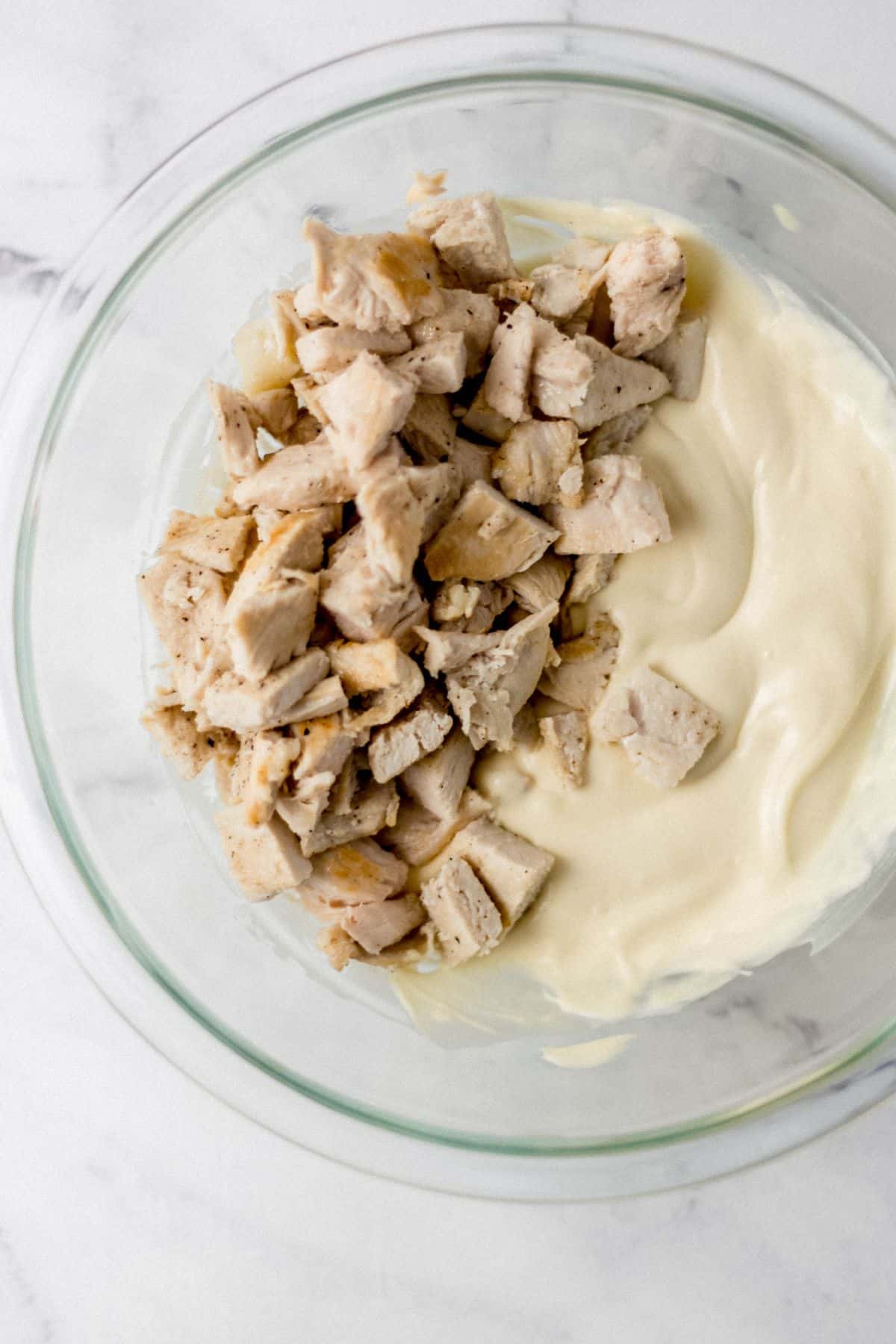 - Preheat the oven to 350 degrees F. In a medium-sized bowl, stir together the 1 can (10.5 ounces) of cream of chicken soup and 3 tablespoons of mayonnaise until combined. Add the prepared chicken to the soup mixture and stir to combine.