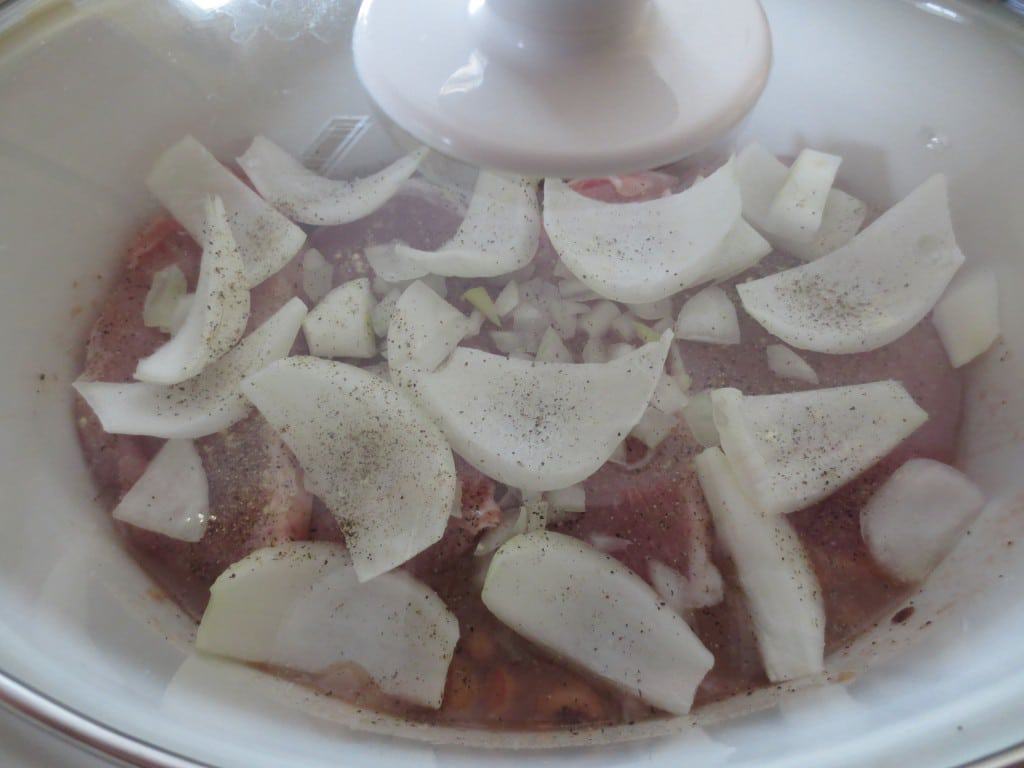 - Grab your slow cooker, crock pot, or pressure cooker with a slow cooker setting. Using a large bowl, place the 1.5 pounds pork chops in it and season both sides of each pork chop with 1 teaspoon garlic powder, 1 teaspoon salt, and 1 teaspoon ground black pepper.