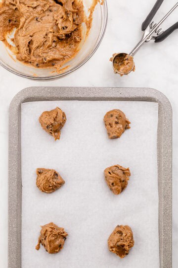 - Spoon the cookie dough onto the prepared cookie sheet, in 1 heaping tablespoon of cookie dough, spaced at least an inch apart.