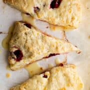 These homemade cranberry orange scones are a delicious blend of sweet and tart in every bite. Made with frozen cranberries, fresh orange zest, and topped with a simple orange glaze, they're flaky on the outside and tender inside, ready in just 30 minutes.