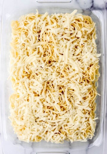 - Spread spaghetti evenly in prepared baking dish. Sprinkle with ½ cup mozzarella.