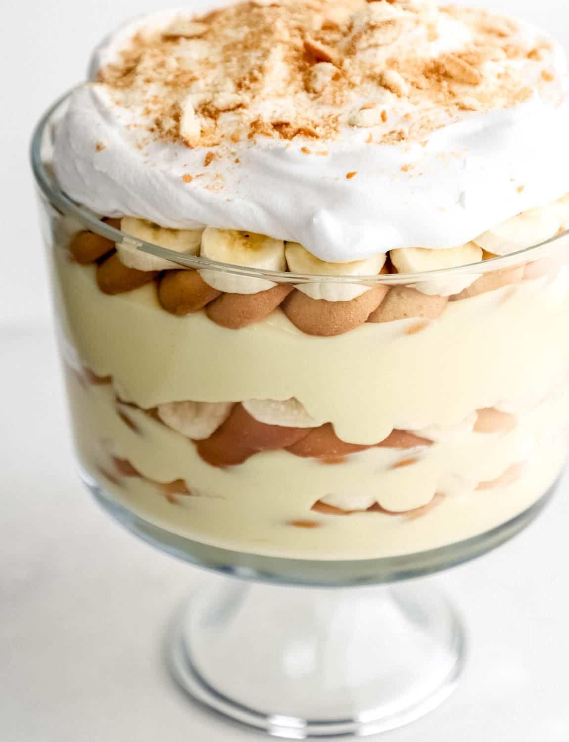This particular banana pudding recipe is made in a trifle bowl or trifle dish and should easily serve 16 people. If you need less and want to make it in a baking dish or large glass bowl, then simply cut the ingredient list in half and it should make enough servings for 8 people.