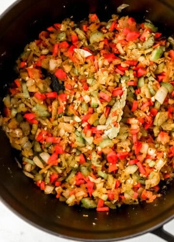 - Stir in 3-4 garlic cloves, 1 teaspoon smoked paprika, 1 teaspoon thyme, 1 teaspoon poultry seasoning, 1 bay leaf, 1 teaspoon salt, and ½ teaspoon black pepper. Cook 30 seconds.