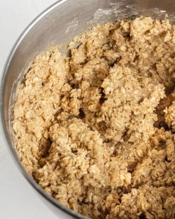 - With the mixer on low speed, gradually add the flour mixture to the butter mixture until just combined. Add the 3 cups oats and mix on low until evenly distributed throughout the dough.