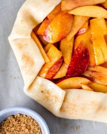 - Brush the crust with 1 tablespoon melted butter or coconut oil and sprinkle with 1 ½ tablespoons turbinado sugar if using.