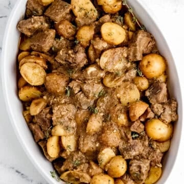 These Slow Cooker Garlic Steak and Potatoes are a cozy, one-pot dinner made with tender steak, baby potatoes, and a buttery garlic herb sauce. Everything cooks together low and slow in the crockpot for a hands-off meal that's perfect for weeknights or Sunday supper.