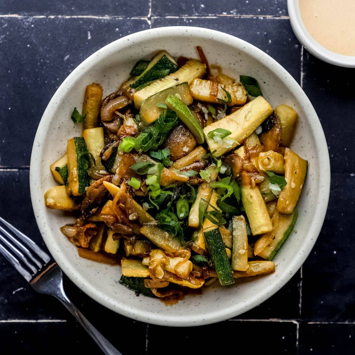 A flavorful stir-fry of zucchini, onions, and mushrooms, a lighter option for balance.
